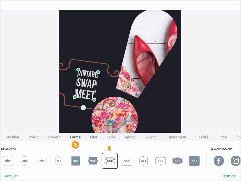 15. Appuyez sur Forme. Faites glisser votre doigt sur l'écran pour parcourir les options disponibles. Appuyez sur ‘décorations’ pour prévisualiser les formes. Sélectionnez celle de votre choix et appuyez sur Terminé.