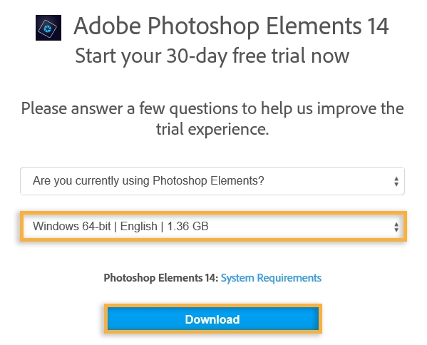 Consultez la page de téléchargement de la version d’essai de Photoshop Elements ou la page de téléchargement de la version d’essai de Adobe Premiere Elements.