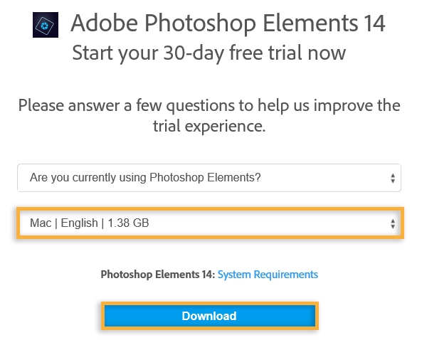Découvrez comment télécharger la version d’essai d’Adobe Photoshop Elements ou d’Adobe Premiere Elements. Sélectionnez votre système d’exploitation et suivez les instructions :