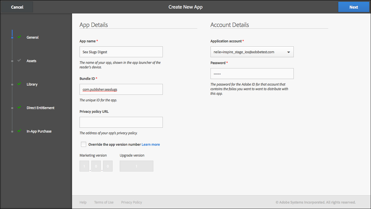 ID d’intégrateur. Adobe fournit un ID d’intégrateur sous réserve que votre compte de droits soit en service sur nos serveurs. Cette option n’est disponible que pour les clients Enterprise de Digital Publishing Suite. Contactez votre représentant Adobe pour plus d’informations sur l’ID d’intégrateur.