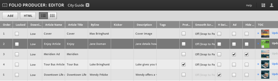 L’éditeur Folio Producer vous permet de modifier des paramètres d’article, certains d’entre eux n’étant pas disponibles dans le panneau Folio Builder. L’éditeur présente deux modes : l’Affichage par vignettes pour prévisualiser les articles et changer leurs propriétés et l’Affichage par liste pour trier, verrouiller et modifier d’autres paramètres.