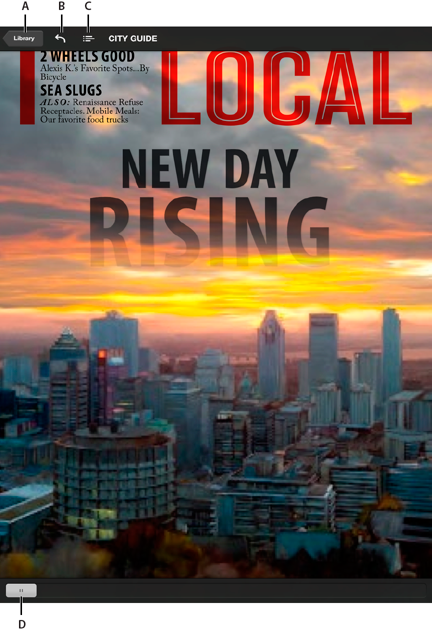 Appuyez sur une zone non interactive pour afficher les barres de navigation (parfois appelées « HUD », pour Heads-Up Display). Appuyez sur le bouton Bibliothèque pour accéder directement à la bibliothèque dans une application à plusieurs publications, ou sur le bouton Accueil pour revenir au premier article dans une application à publication unique. Appuyez sur le bouton Retour pour revenir à l’affichage précédent. Appuyez sur l’icône Table des matières afin de visualiser la table des matières. Faites glisser la barre de défilement pour faire défiler les vignettes en mode de navigation.