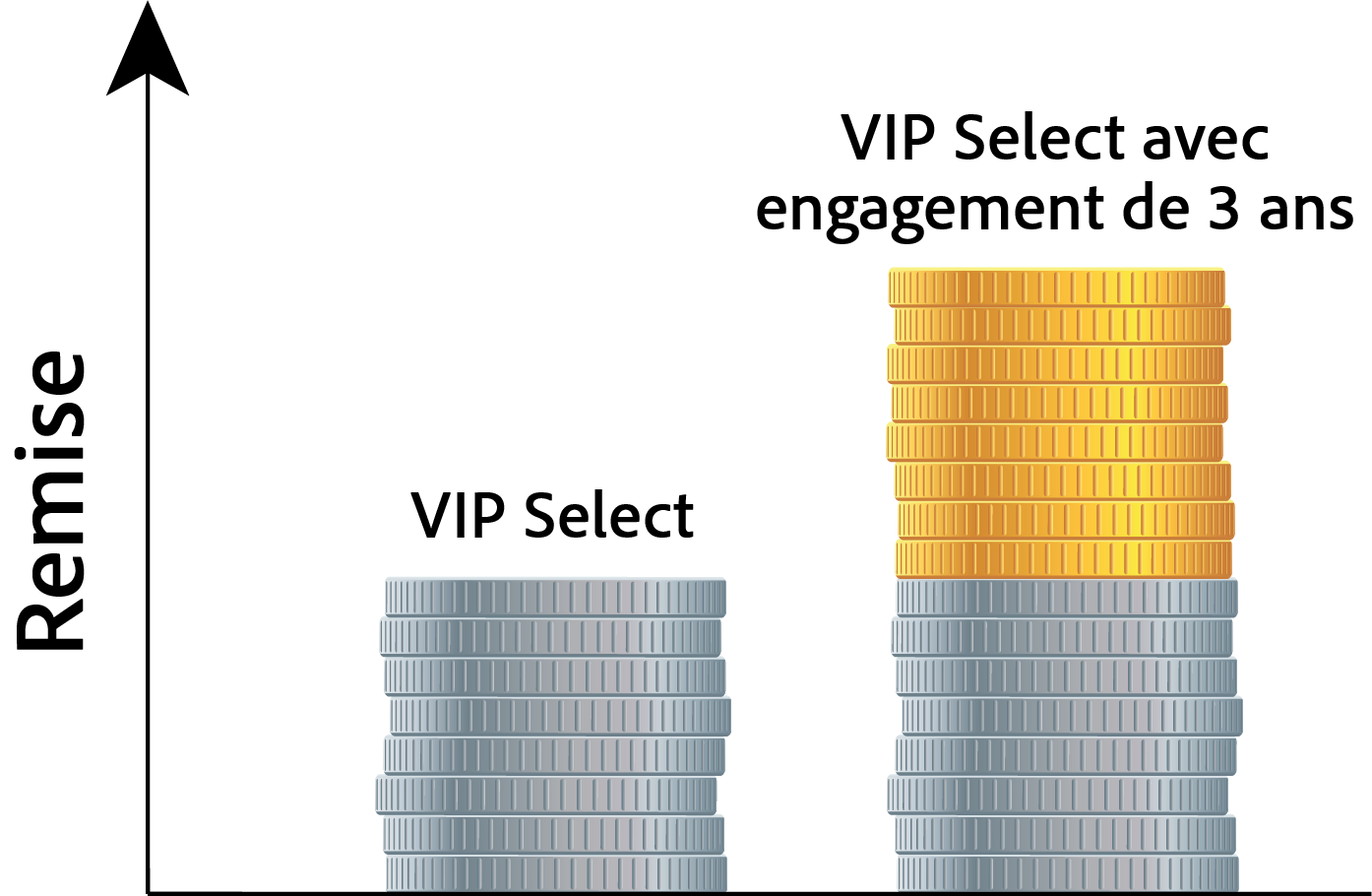 Un membre VIP s’engage à commander et à renouveler un nombre convenu de licences avant sa date anniversaire pour une durée maximale de trois ans. De plus, lorsqu’il migre vers VIP Marketplace, le membre accepte que le nombre convenu de licences est renouvelé automatiquement à sa date anniversaire sur VIP Marketplace.  En échange, Adobe s’engage à proposer des prix réduits convenus* pendant la durée de l’engagement de 3 ans du membre. Un engagement de 3 ans permet une budgétisation jusqu’à 3 ans. Avec un engagement de 3 ans, vous bénéficiez d’un niveau de remise sur tous les achats VIP pendant la durée de l’engagement (jusqu’à 3 ans, via 2 renouvellements). Vous pouvez également ajouter des licences supplémentaires ou des transactions Sign, et vous n’aurez toujours à renouveler que la quantité pour laquelle vous vous êtes engagé pendant la période d’engagement de 3 ans.