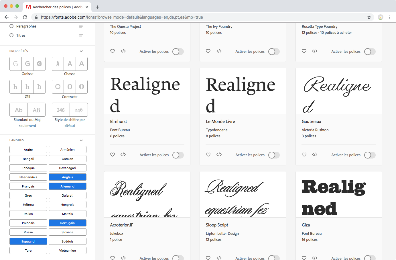 Les polices web prennent en charge différentes langues. Utilisez le menu déroulant LANGUES ET SYSTÈMES D’ÉCRITURE pour parcourir les polices et trouver celles prenant en charge une langue ou un script en particulier, ou référez-vous à la prise en charge linguistique globale d’une police depuis la page de sa famille de polices.