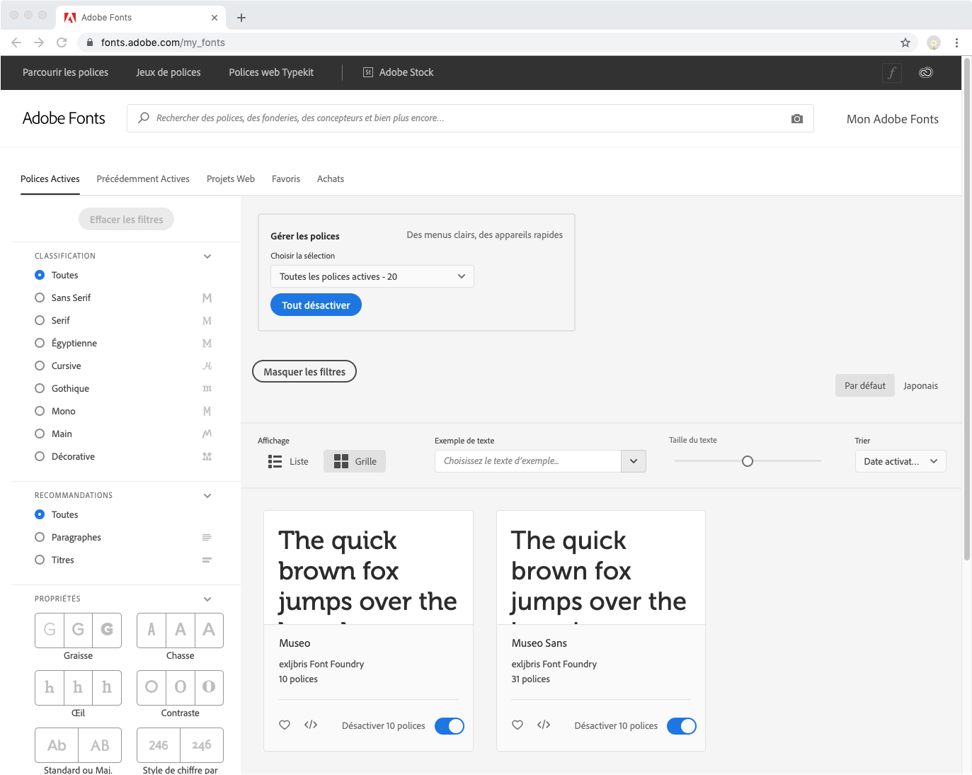 En effet, les polices que vous cessez d’utiliser pendant plusieurs mois* expirent dans votre système. Elles demeurent cependant visibles dans vos sélections de polices Adobe et restent disponibles dans vos applications Adobe jusqu’à ce que vous décidiez de les supprimer.