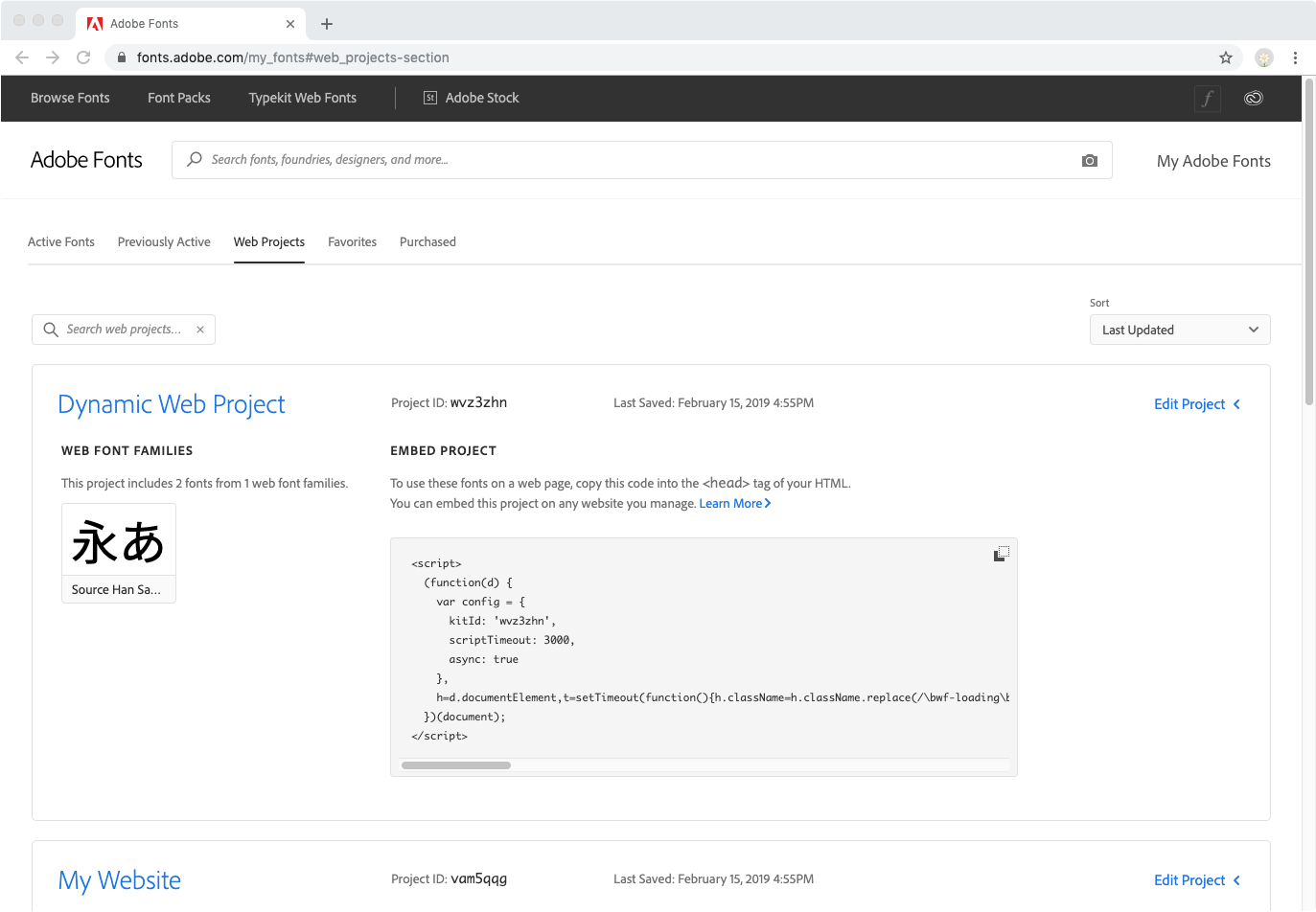 Tous vos projets web sont répertoriés par police dans la section Projets web. Cliquez sur le lien Modifier le projet pour modifier les sélections de polices de ce projet, mettre à jour la prise en charge linguistique ou le supprimer.