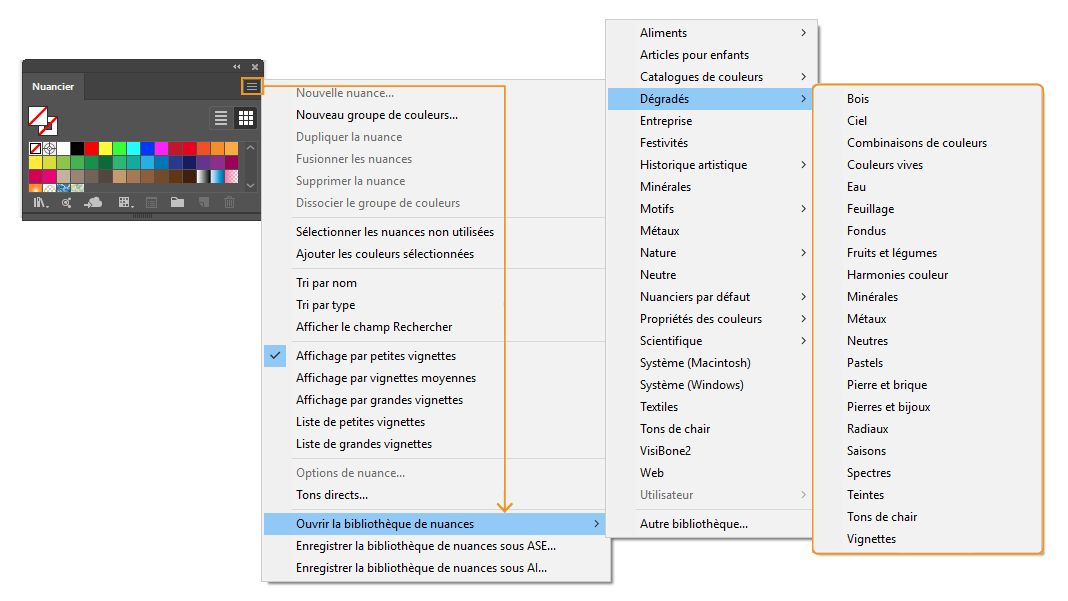 Créez des dégradés directement à l’aide de Plus d’options dans le panneau Nuancier. Créez des dégradés directement à l’aide de Plus d’options dans le panneau Nuancier.