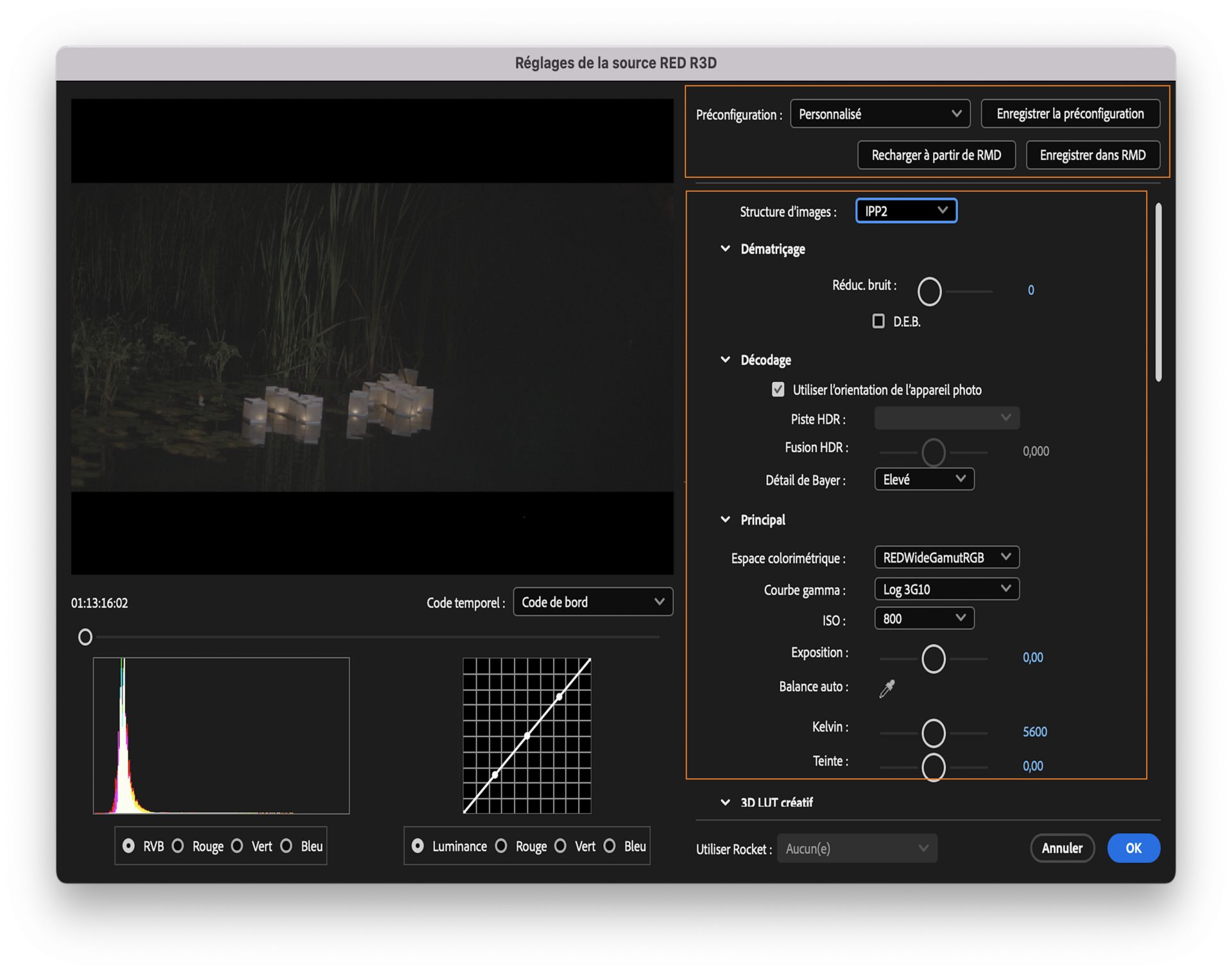 Définissez les paramètres prédéfinis et le pipeline d’images. Vous pouvez ajuster le dématriçage, le décodage, la LUT Creative 3D, et d’autres paramètres depuis la fenêtre Paramètres de la source RED R3D. Sélectionnez OK.
