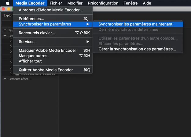 Pour gérer les paramètres synchronisés, sélectionnez Media Encoder > Synchroniser les paramètres (Windows) ou Media Encoder > Synchroniser les paramètres et cliquez sur Gestion de la synchronisation des paramètres (Mac OS).