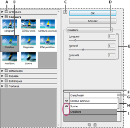 A. Catégorie de filtre B. Vignette du filtre sélectionné C. Afficher/Masquer les vignettes des filtres D. Menu Filtre E. Options du filtre sélectionné F. Liste d’effets de filtre à appliquer ou à organiser G. Filtre masqué H. Filtres cumulés mais non sélectionnés I. Filtre sélectionné mais non appliqué