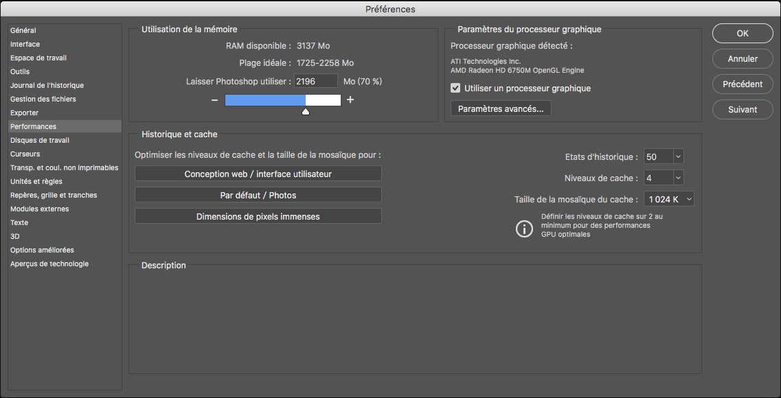Des paramètres supplémentaires tels que Disques de travail, disponibles dans d’autres onglets de la boîte de dialogue Préférences, peuvent également avoir un impact direct sur la vitesse d’exécution et la stabilité de votre ordinateur.