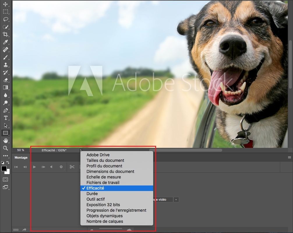 Regardez l’indicateur d’efficacité pour analyser les performances pendant que vous travaillez dans Photoshop. Cliquez sur le menu déroulant en bas de la fenêtre de l’image et choisissez Efficacité dans le menu déroulant.