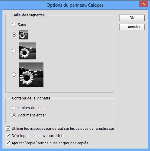 Pour réduire ou désactiver ces vignettes d’aperçu, cliquez sur le menu du panneau et choisissez Options de panneau. Sélectionnez une plus petite taille de vignette ou choisissez Aucun, puis cliquez sur OK.