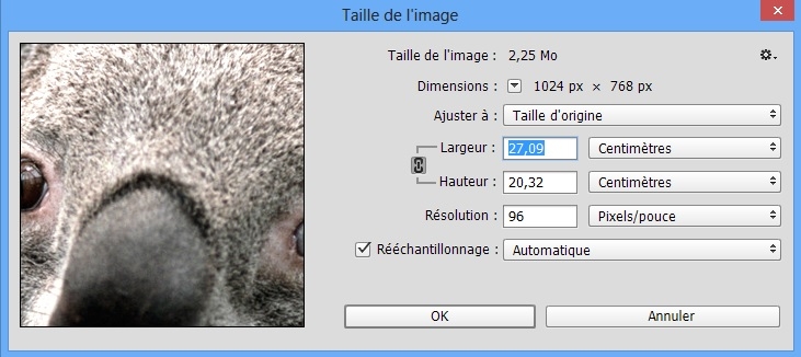 Pour les images affichées à l’écran, pensez en termes de dimensions en nombre total de pixels. Pour réduire les dimensions d’une image, sélectionnez Image > Taille de l’image. Dans la boîte de dialogue Taille de l’image, vérifiez que l’option Rééchantillonnage est sélectionnée. Saisissez une nouvelle valeur pour les dimensions largeur ou hauteur (entrer une valeur pour une dimension modifie les deux).