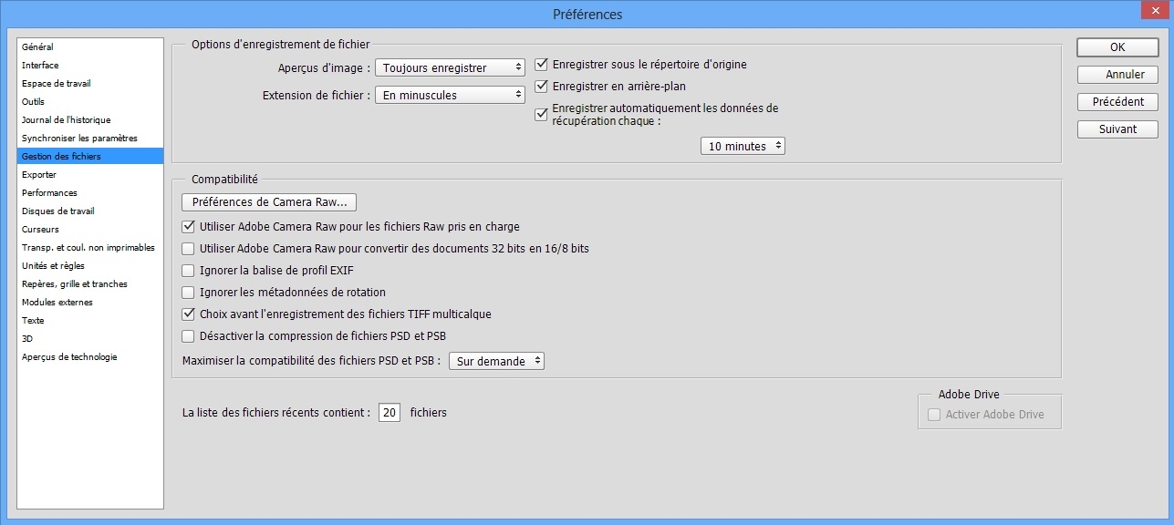 Dans Préférences > Gestion des fichiers, pour les documents 16 et 32 bits des fichiers PSD et PSB, sélectionnez l’option Désactiver la compression des fichiers PSD et PSB.