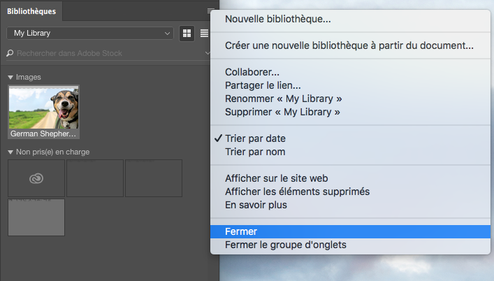 Dans le menu de survol Bibliothèques, sélectionnez Fermer.