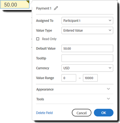 Un champ de paiement défini par le signataire permet à l’utilisateur de saisir directement la valeur du paiement. Il doit être configuré en tant que Valeur saisie et la fonction Lecture seule doit être désactivée.