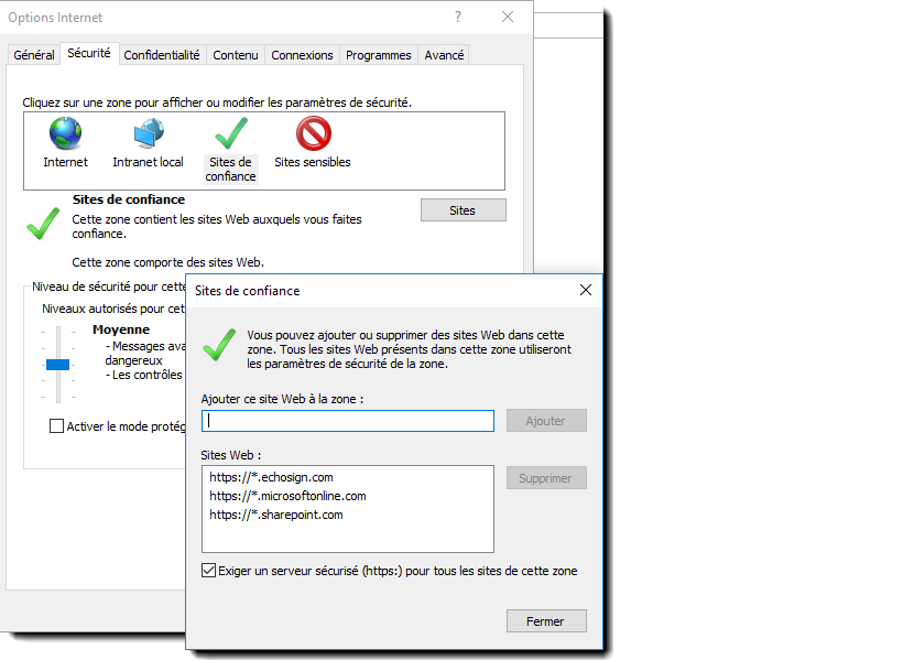 Pour que les compléments SharePoint fonctionnent avec les navigateurs Edge, une configuration des sites de confiance est nécessaire. Internet Explorer et les anciennes versions d’Edge ne sont pas pris en charge.