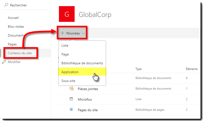2. Accédez à Contenu du site > Nouveau > Application.