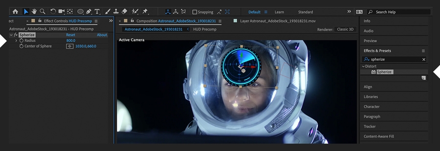 Back in the main comp, add the Spherize effect to the precomp layer and increase Radius to add some curvature to it. Depending on where your HUD belongs in the scene, adjust Center of Sphere’s X and Y values too. Play the comp to see how the HUD appears affixed to its intended surface as the camera moves in on the subject.
