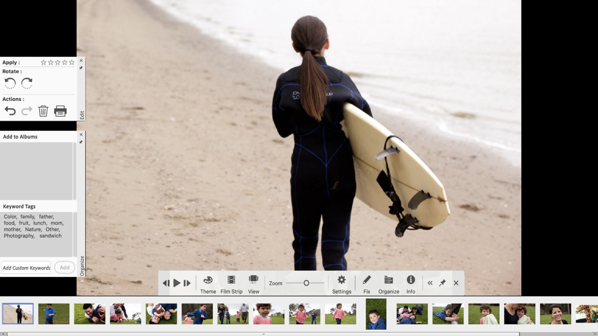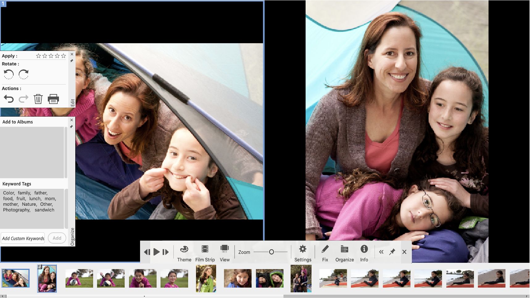 Displays all the selected images in a strip of thumbnails on the right side of the screen. To choose which image is displayed in full screen, click a thumbnail.