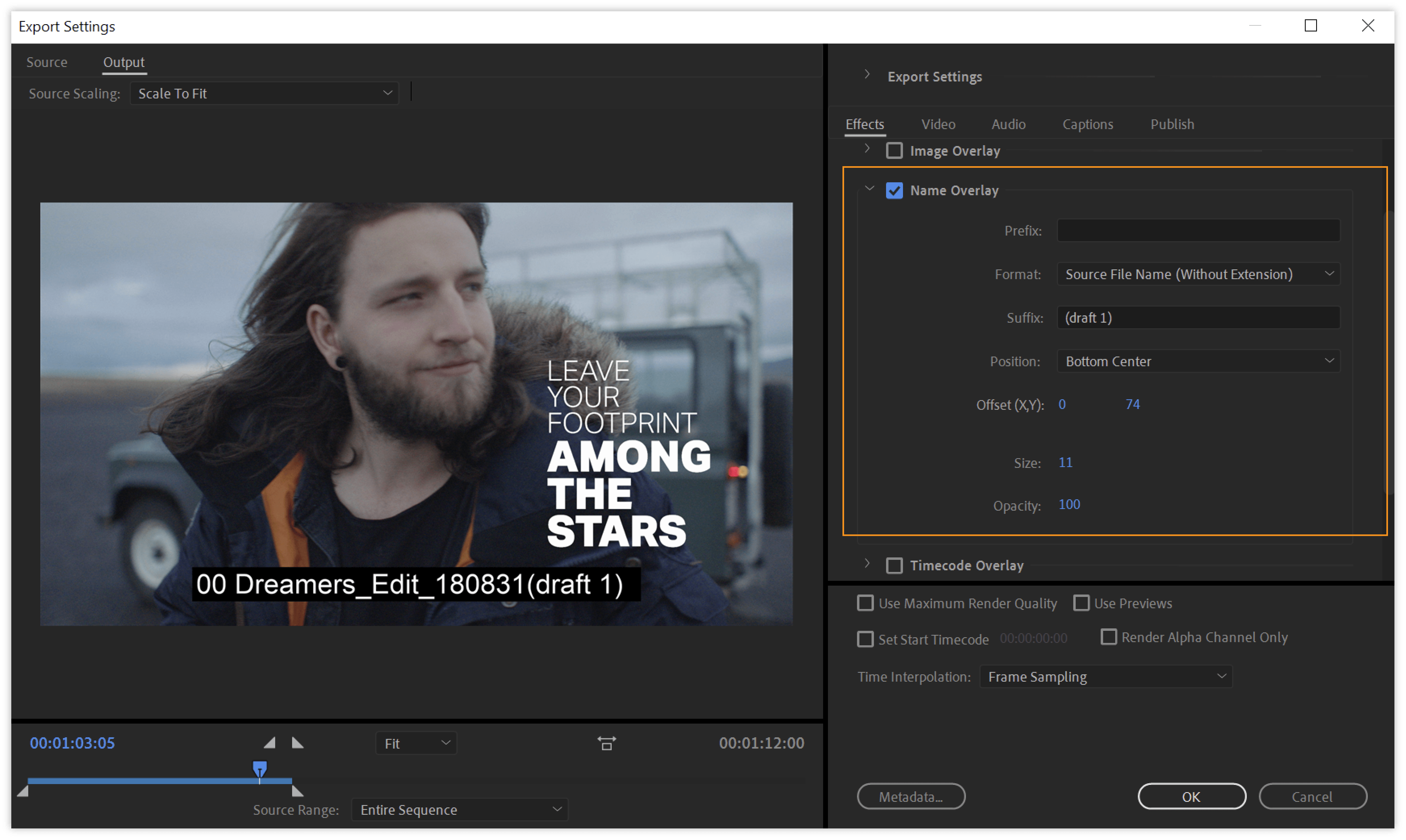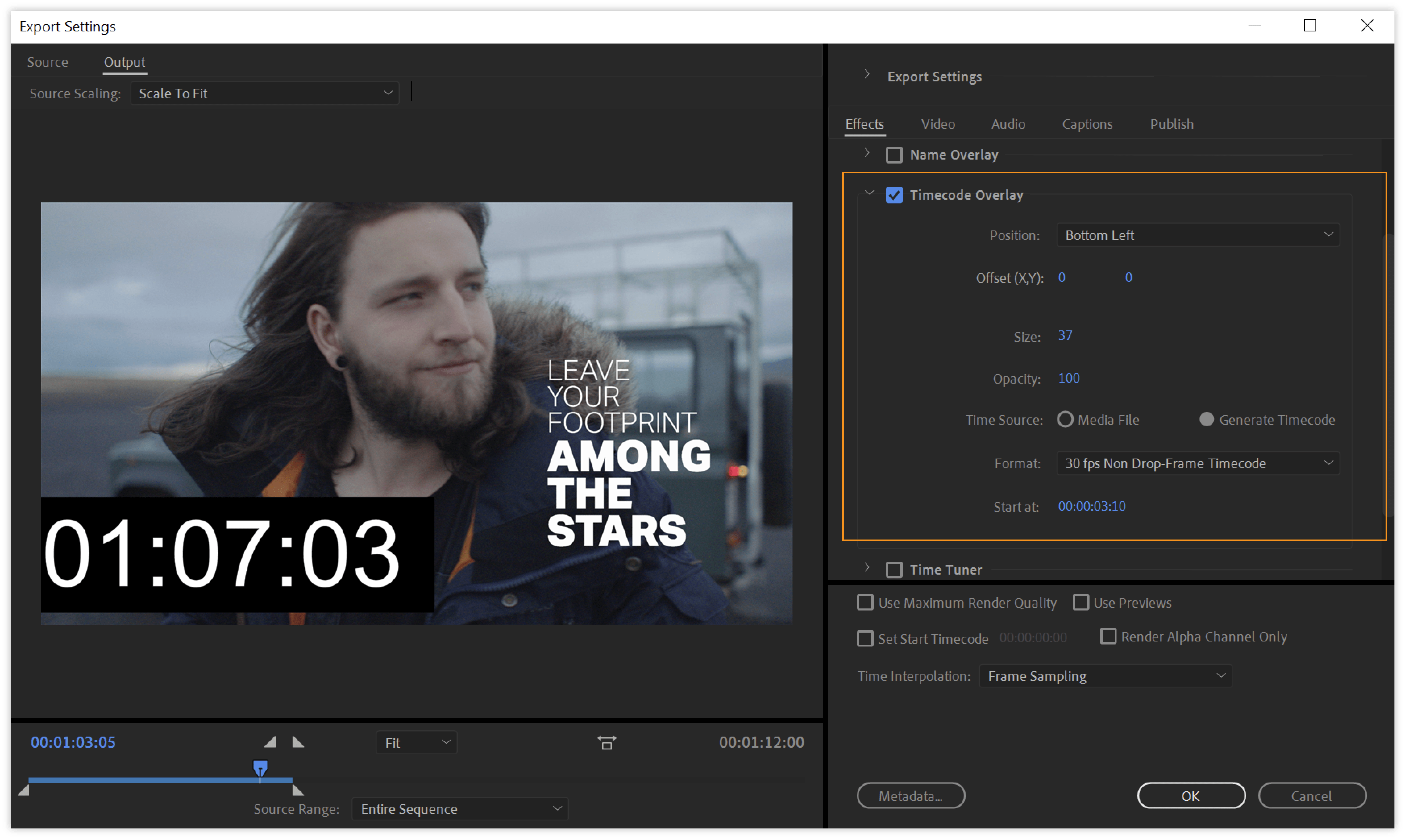 Enable this option to specify a starting timecode for your exported media that is different from the source’s timecode. Leave this option deselected to use the source’s timecode on export.