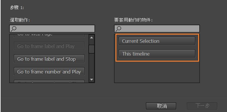 根據您所選取的動作類型,也可以選擇想套用動作的對應物件。如果物件擁有實體名稱,您可以搜尋舞台上的特定物件。而且,您也可以在目前選取範圍上套用動作。