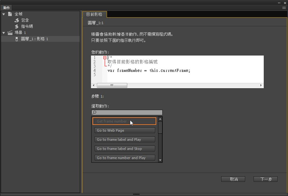 範例螢幕快照顯示動作的動作程式碼選項 範例螢幕快照顯示動作的動作程式碼選項 在上方螢幕快照中,已選取「取得影格編號」動作,並在動作視窗中已更新對應的程式碼。