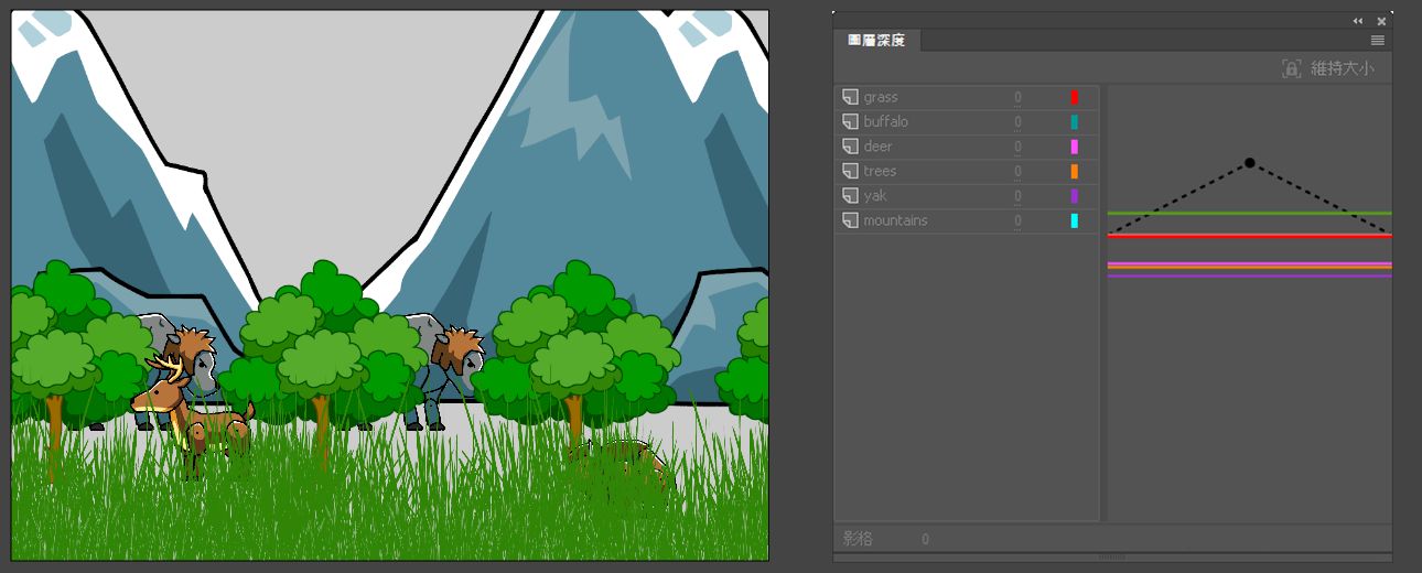 - 靠近攝影機的物件具有高圖層深度的負值,距離攝影機較遠的物件具有高圖層深度的正值。