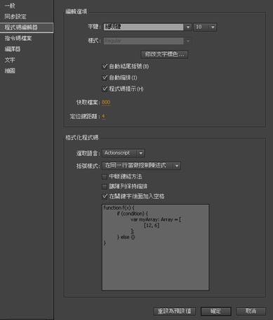 在「程式碼編輯器」索引標籤中,您可以設定程式碼在 Flash 中顯示的方式。