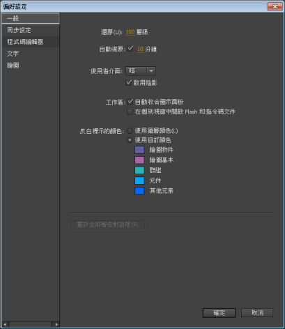 類別編輯器:選取編輯器,以便編輯類別。選項包括 Flash Professional、Flash Builder 或詢問。
