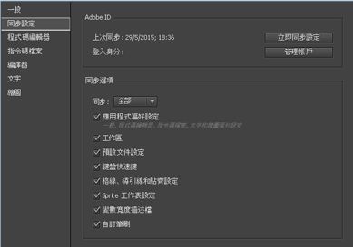 這會顯示您已在 Flash 和 Creative Cloud 帳戶之間設定的同步選項。您可以同步應用程式偏好設定、工作區、預設文件設定、鍵盤快速鍵、格線、導引線、貼齊設定、Sprite 工作表設定、變數寬度描述檔,以及自訂筆刷。