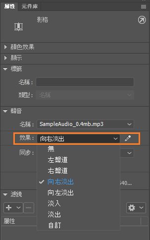 Animate 會記住屬性檢測器中的音效同步處理選項。如果從「屬性檢測器」的「聲音」區段選取聲音,接著嘗試對「屬性檢測器」中的新關鍵影格設定其他聲音,Animate 會記住前一個聲音的「串流」或「事件」同步選項。