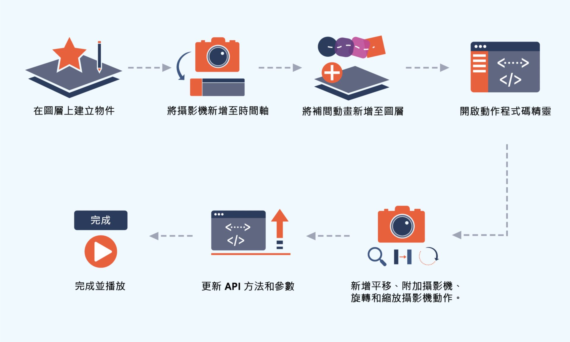 下列流程圖說明使用互動式攝影機建立動畫的逐步方法。您可以在 HTML Canvas 文件中使用動作程式碼精靈。