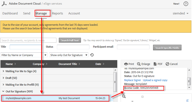 適用於: Document Cloud 某些 Creative Cloud 应用程序、服务和功能在中国不可用。 eSign 服務替代簽署程序 如果簽署電子郵件並未送達客戶手中,我們提供另一種方式,可將合約送達客戶面前,並請客戶簽署。 登入 Document Cloud eSign 服務網站,然後按一下「管理」標籤,以檢視所有等候簽署的合約。 找出有問題的合約,然後按一下該合約加以選取。 將合約右側的小資訊視窗向下捲動,並找出「存取代碼」。這組代碼為每個文件專屬的代碼。 請簽署人瀏覽至 http://www.echosign.com/esign,然後輸入該組「存取代碼」。 然後,系統便會提示該客戶如常簽署文件。 法律說明 | 線上隱私權政策