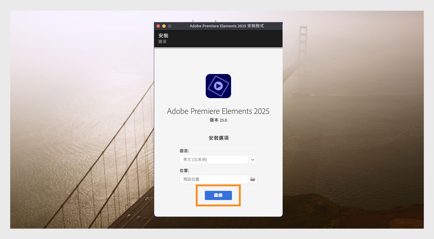 - macOS:導覽到 Adobe Premiere Elements <year> > Install.app 並啟動安裝程式。 若出現提示,請輸入您系統的密碼。