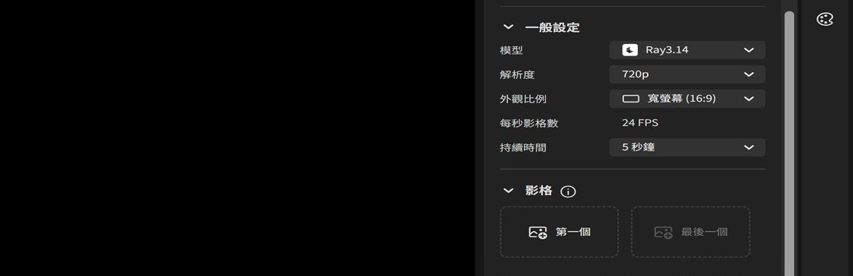 當您選取 Ray2 作為模型時,您也可以新增最後一個畫格影像。 若要新增最後一個影格影像,請在「影格」下選取「最後一個」。