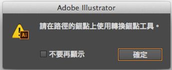 增強功能: 在 Illustrator CC 2014 中,已移除此警告。如果您按錯位置,選取的路徑或錨點不會出現任何變更。此變更是為了讓您不用按一下關閉警告,以使設計的工作流程更加順暢。
