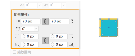 - 強制寬高等比例: 勾選「縮放圓角」核取框,以確保圓角半徑會等比例地隨著物件的變形增加或減少。