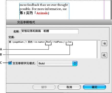 請參閱第 <pageNum> 頁的 <cs name=”bold”><fullPara/></cs> 請參閱第 23 頁的 Animals。 指定字元樣式名稱,並包括您想要將此字元樣式套用到 <cs name=””> 和 </cs> 標記之間的文字。 請參閱在交互參照內套用字元樣式。 |