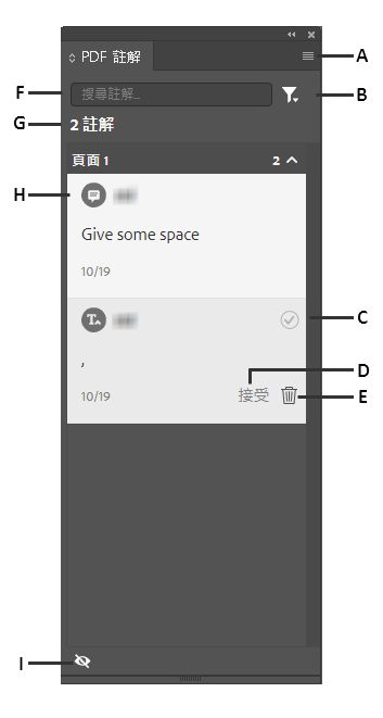 A. 「PDF 注釋」面板選單 B. 篩選注釋 C. 標示為已解決/未解決 D. 接受注釋 E. 刪除注釋 F. 搜尋注釋 G. 注釋數量 H. 注釋類型 I. 在版面中顯示/隱藏注釋