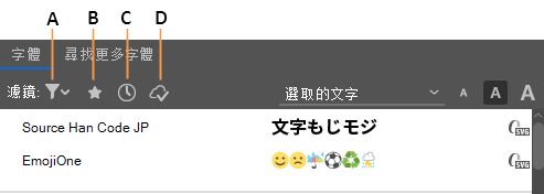 A. 啟用的字型篩選器 B. 「啟動字型」圖示 C. 「停用字型」圖示 D. 「正在啟動」圖示