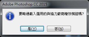 按住 Shift 鍵並啟動 Photoshop。啟動期間,畫面會出現一個對話方塊,詢問「是否略過選用第三方增效模組的載入程序?」