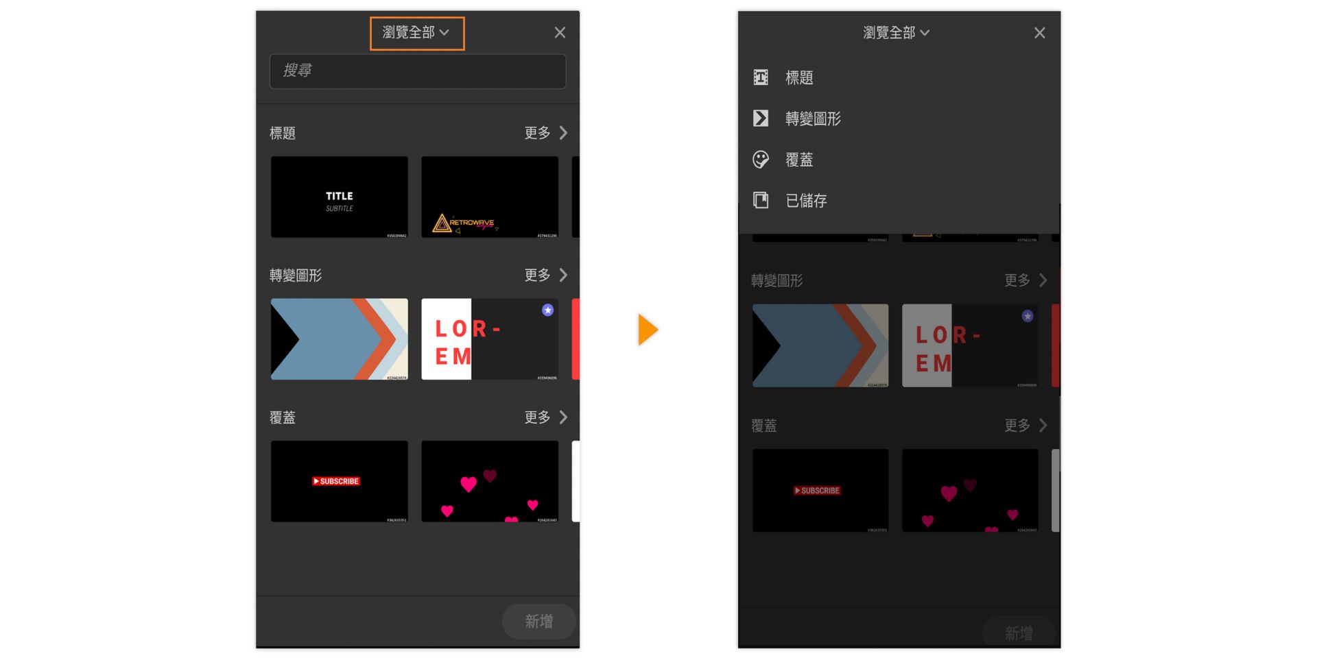 新增圖形 新增圖形 您也可以透過輕觸 瀏覽全部 下拉式按鈕,來搜尋像是標題、轉場圖形等特定資產。您可以儲存資產並稍後從 儲存 存取。