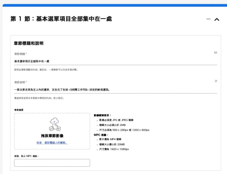 如要了解如何建置章節和步驟,請按一下「建立教學課程」>「教學課程」。