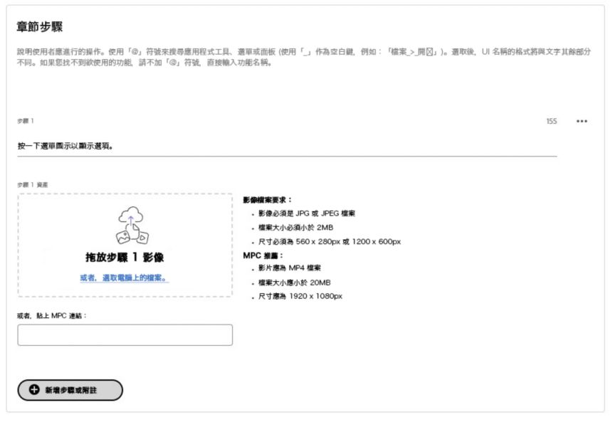 編寫步驟時,請確保編輯內容精簡明白並掌握重點,我們希望步驟在「無需捲動」即能看到的位置;此外,大段文字會讓使用者感到疲勞,請以讓使用者保持興趣與專注並遵循教學課程的方式來編輯。