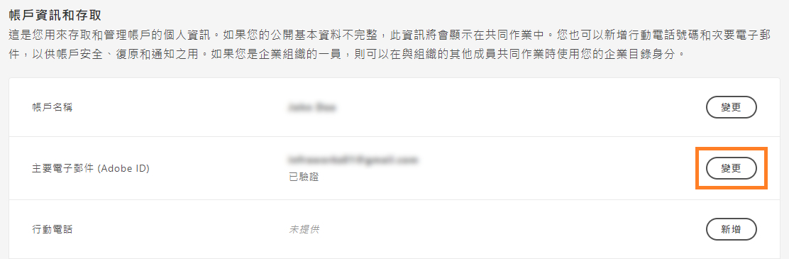 在「帳戶資訊和存取」區域中,使用其他有效電子郵件地址變更您的現有電子郵件地址。