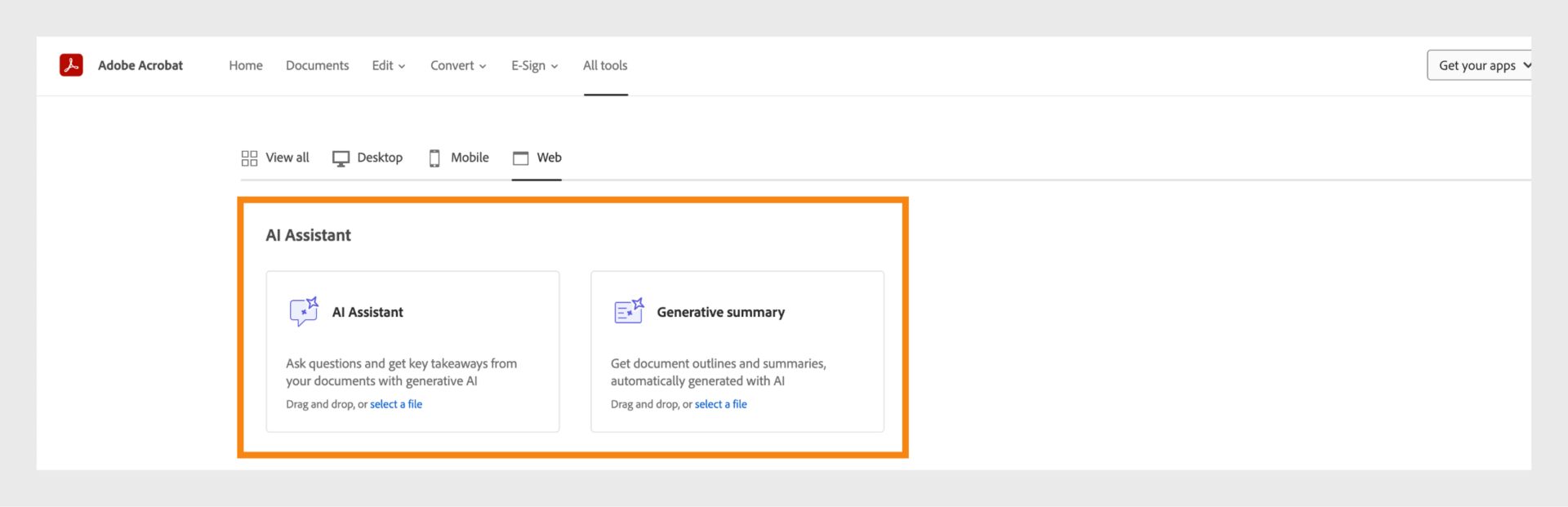 Másik lehetőségként az Acrobat Kezdőlapon válassza ki az Összes eszköz lehetőséget, majd válassza az MI asszisztens vagy a Generatív összefoglaló eszközt.