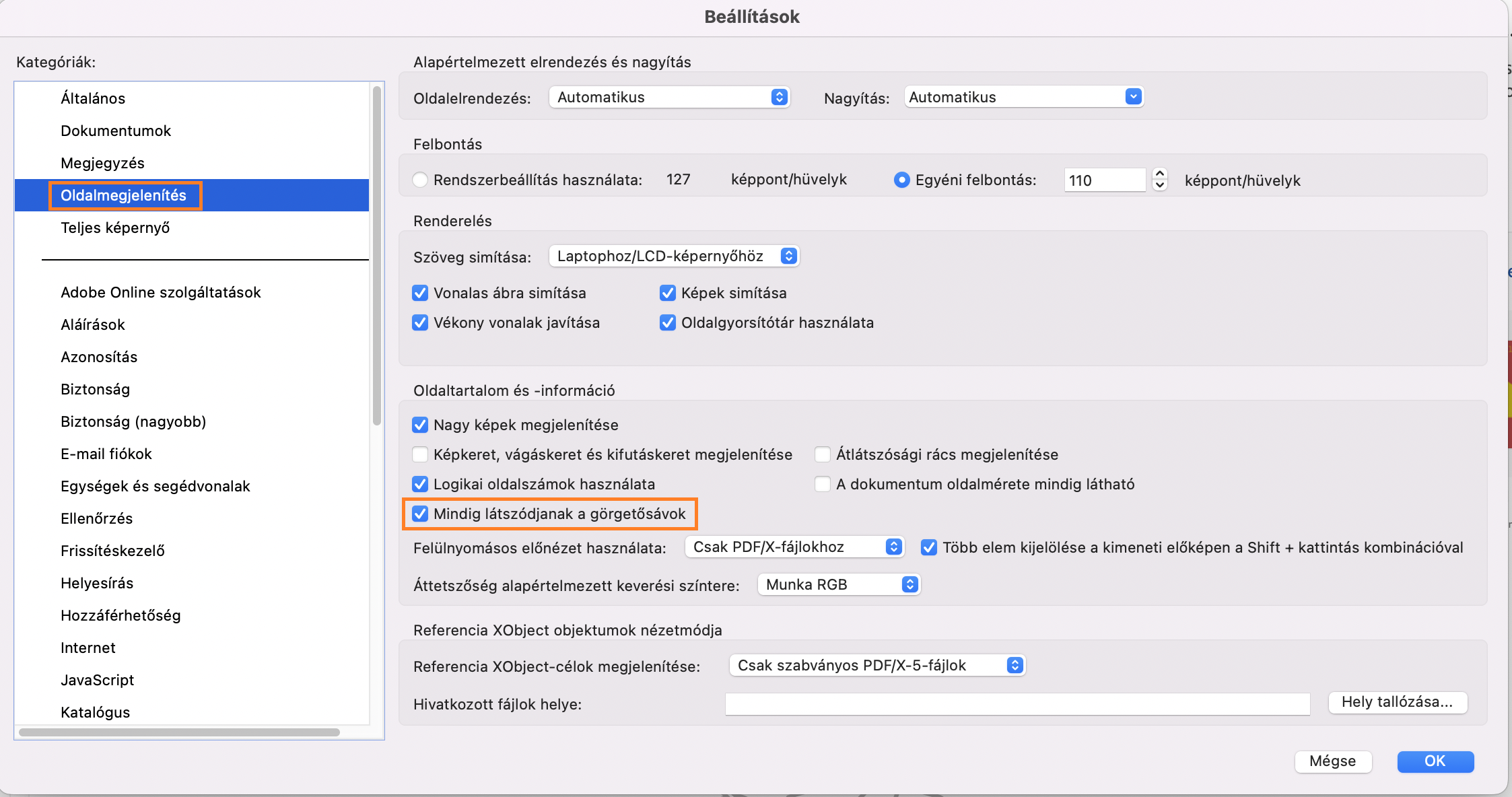 Az alábbi lépések végrehajtásával engedélyezheti, hogy a görgetősáv mindig megjelenjen az Acrobat vagy Acrobat Reader programban: