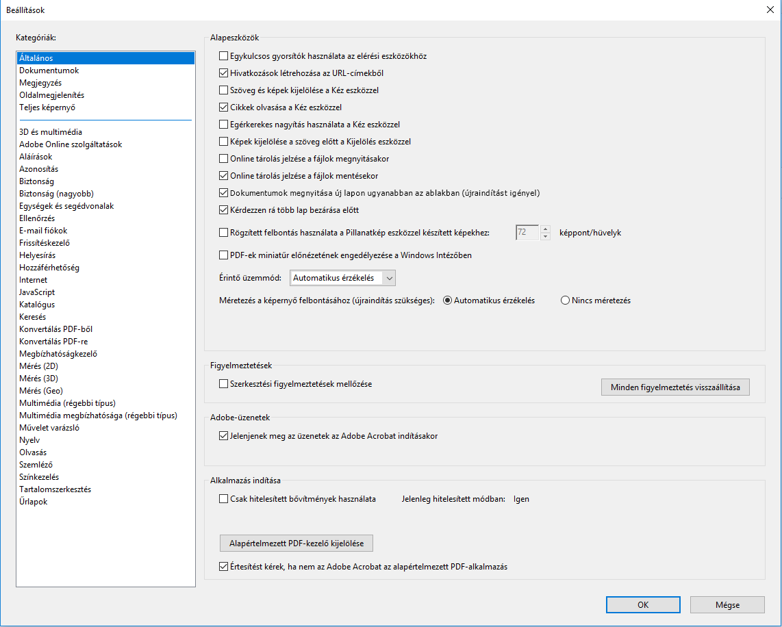 Ezek a beállítások az alkalmazás általános viselkedését szabályozzák, tehát nem egy adott PDF-dokumentumhoz vannak hozzárendelve. A Beállítások párbeszédpanel megnyitásához válassza a hamburger menüt (Windows) > Beállítások vagy az Acrobat / Adobe Acrobat Reader > Beállítások(macOS) lehetőséget.